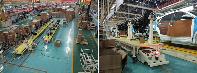 Anhui Cheetah Automobile Co., Ltd. belongs to Changfeng Group, which mainly produces SUV and pickup trucks. The AGV project is used for instrument cluster logistics distribution in the assembly shop. AGV transports the assembled instrument panel to the interior line through the traction trolley. AGV belt The empty trolley returns to the instrument panel line and runs in circulation to meet the 40JPH beat of the production line. AGV adopts the track navigation system and realizes unmanned automatic transportation through the instant communication of the control system with other management systems. It is the choice for the automotive industry to enhance the competitiveness of the industry, reduce labor costs and improve the efficiency of warehouse allocation.